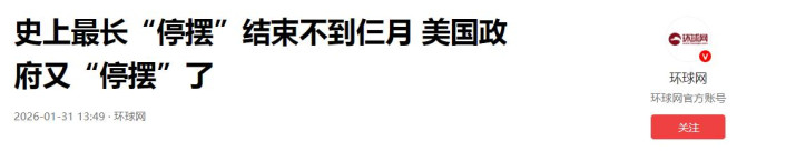 2026-01-31 13:49·环球网——《史上最长“停摆”结束不到仨月 美国政府又“停摆”了》