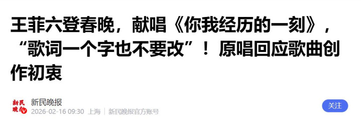 新民晚报:《王菲六登春晚,献唱《你我履历的一刻》,“歌词一个字也不要改”!原唱回答歌曲创作初志》发布时辰:2026.2.16