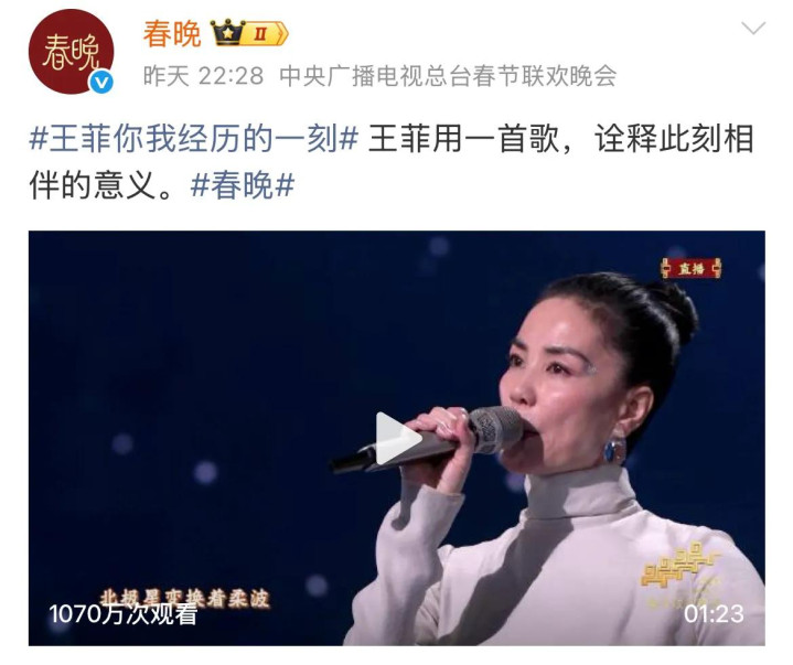 可一曲完后,春晚连夜发文称其为:“王菲用一首歌,阐扬此刻相伴的真谛”