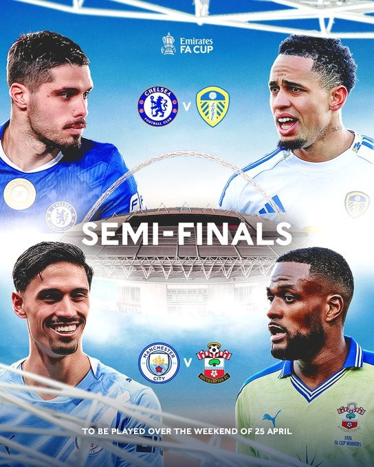 温布利开战!足总杯半决赛对阵:曼城vs南安普顿,切尔西vs利兹联