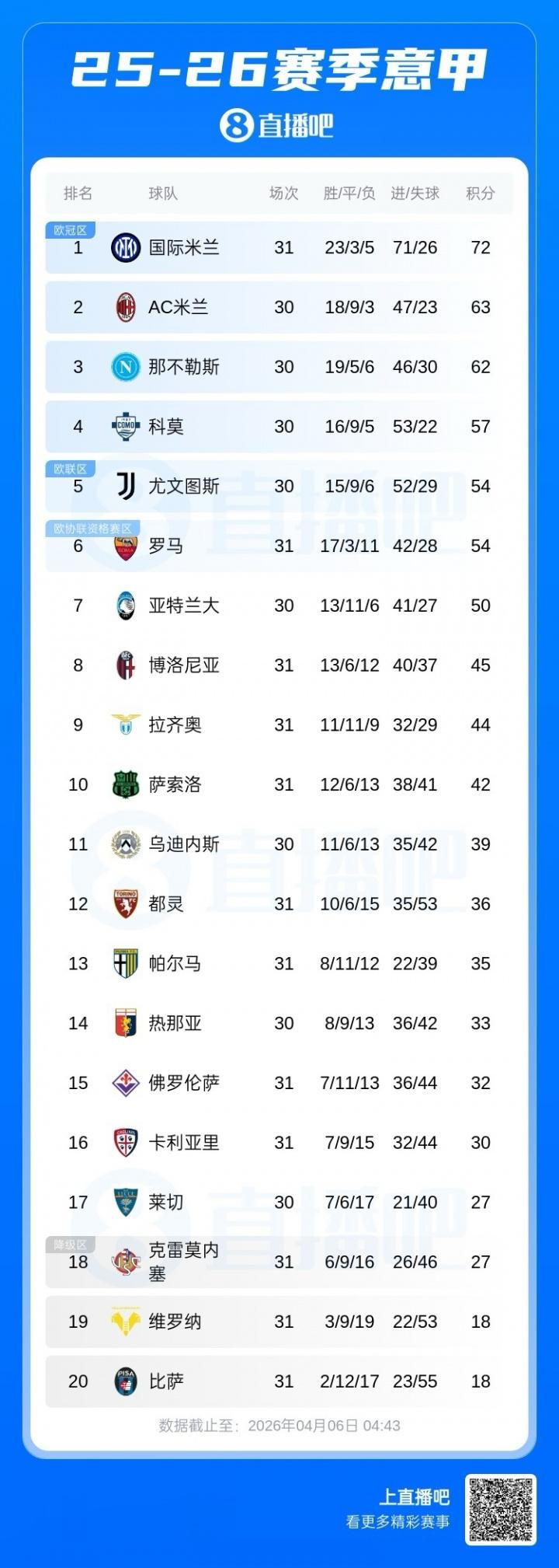 意甲积分榜:国米止3轮不堪先赛9分领跑,罗马多赛距离欧冠区3分