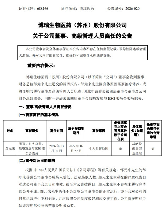彼时,博瑞医药示意,公司将按照干系法定身手尽快补选董事及财务总监。