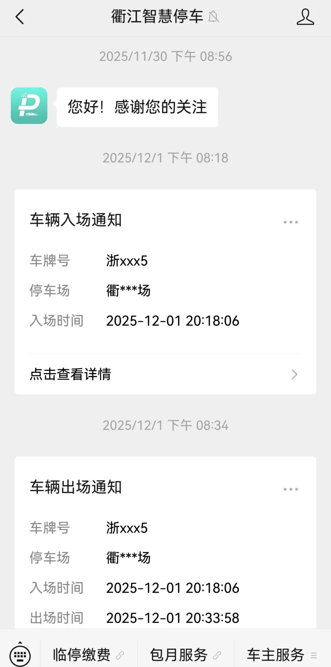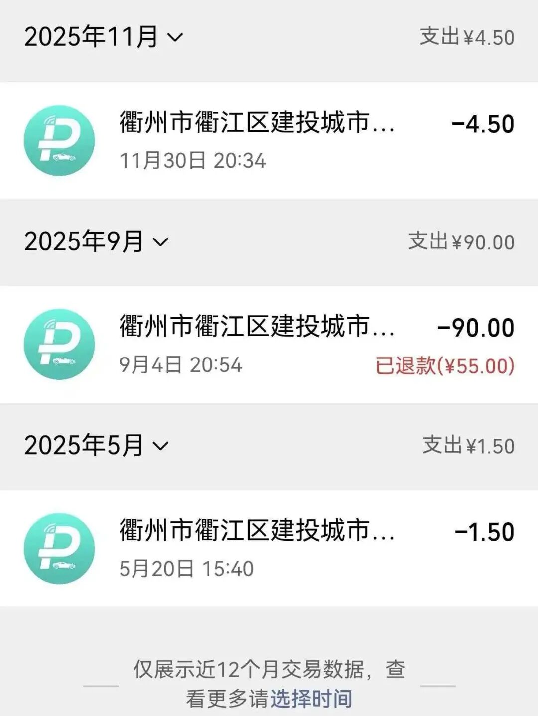 在手机扫码支付前是能看到多笔停车记录的,其中有一笔比较显眼的记录2024年12月左右在衢江区实验中学门口路段长达3天的停车记录,产生55元的费用。