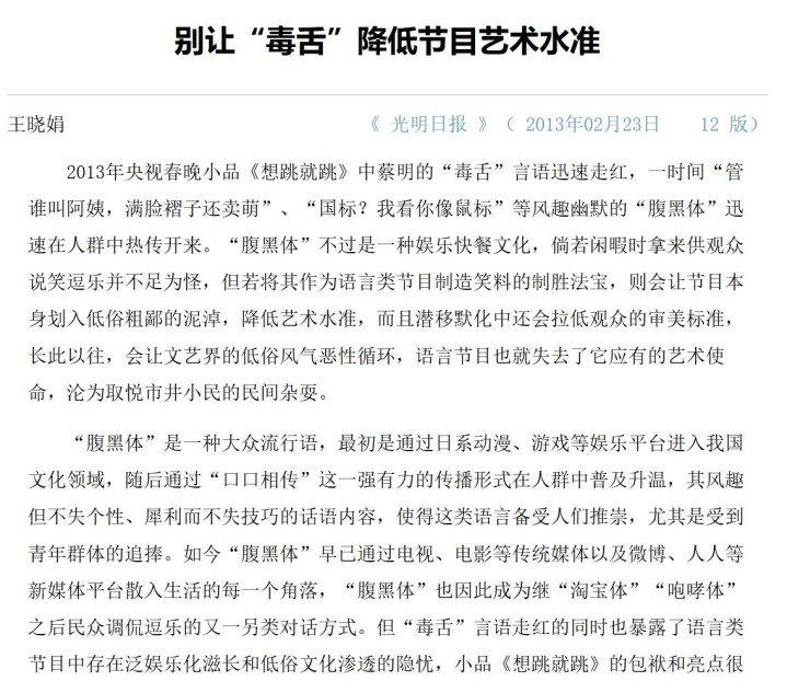 2013年,《想跳就跳》让蔡明的“毒舌老太”东说念主设达到巅峰。“都是千年的狐狸,亚搏app下载玩什么聊斋”“你东说念主是微缩的,心如故鄙陋的”等金句,成为当年的流行语,也让她收货了“弹幕女王”的称呼。但与此同期,“毒舌”格调也激发了争议。据光明网2013年02月23日发文《别让“毒舌”镌汰节目艺术水准》指出,过度的“毒舌”言语,以揭他东说念主之短、击他东说念主之痛博取笑声,可能拉低节目艺术水准,致使孳生低俗文化的隐忧。其时的春晚小品,一度堕入“为了冒犯而冒犯”的误区,搞笑与暖和的均衡,被机敏的吐槽冲突。