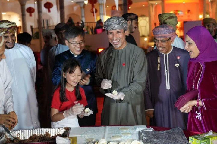 阿曼能源和矿产大臣奥菲(右三)等阿方嘉宾体验包饺子。中国驻阿曼使馆供图