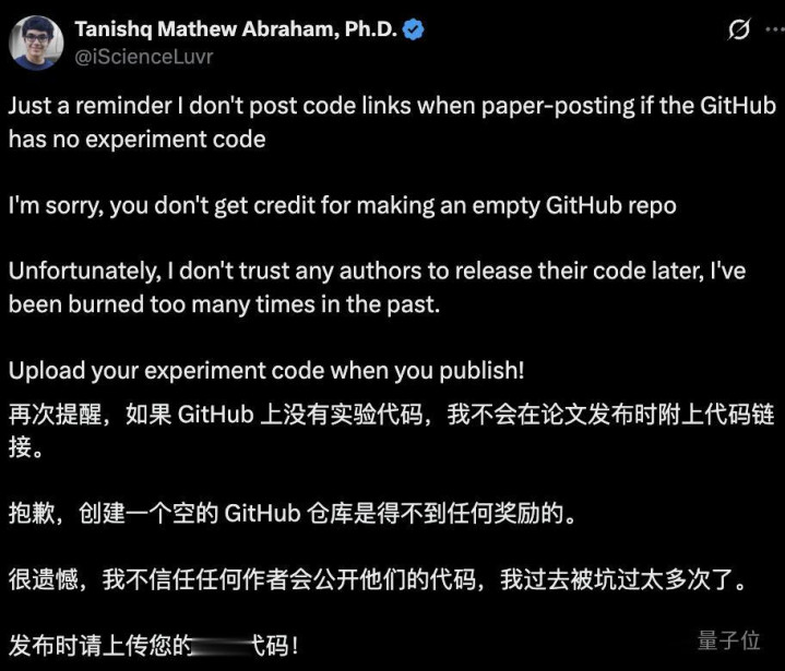 其实,代码仓库放鸽子这事儿也不只是私下牢骚,前Stability AI研究总监Tanishq Mathew Abraham就直接公开diss过这种现象。