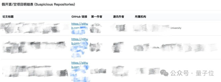 从检索的结果来看,这份检索数据公开了各个机构(横轴)的论文录用数量、真实开源数量、未标明链接文章数和最重磅的假开源数。