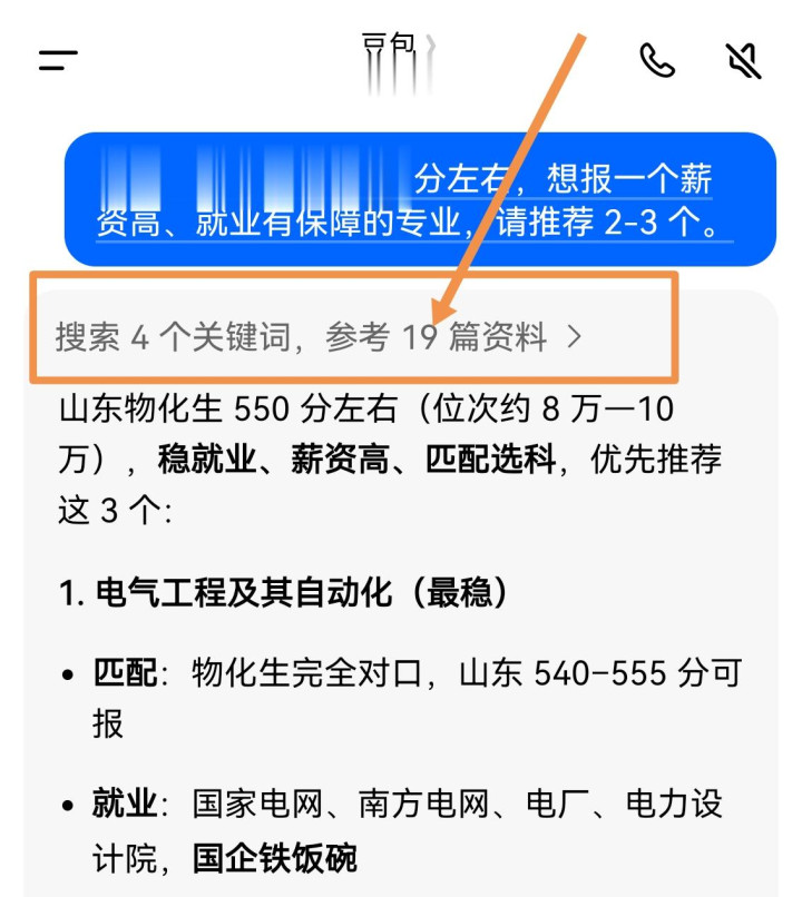 第一幅图,是咱们测试让豆包保举专科,你看,它是自动参考了收集19篇贵寓。