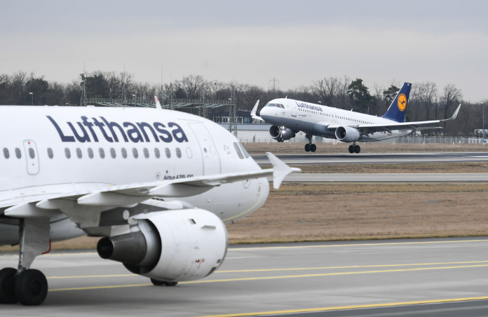 2022年1月17日,两架汉莎航空公司的飞机抵达德功令兰克福机场。新华社记者逯阳摄