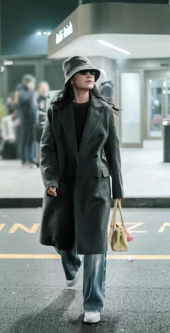 在米兰的街头,她身着宽松黑裙外搭驼色西装,大背头梳得一丝不苟,气场全开。