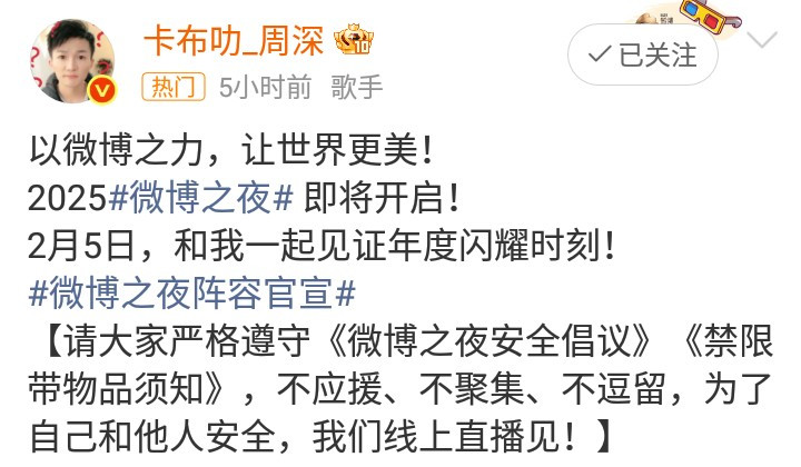 周深参加央视春晚第三次联排演出后,又被微博之夜阵容官宣!可喜可贺! 由此可见,优秀歌手的演出机会,在2026年越来越多!一张帅气的明星偶像官宣照,再现了歌手最帅气的模样!