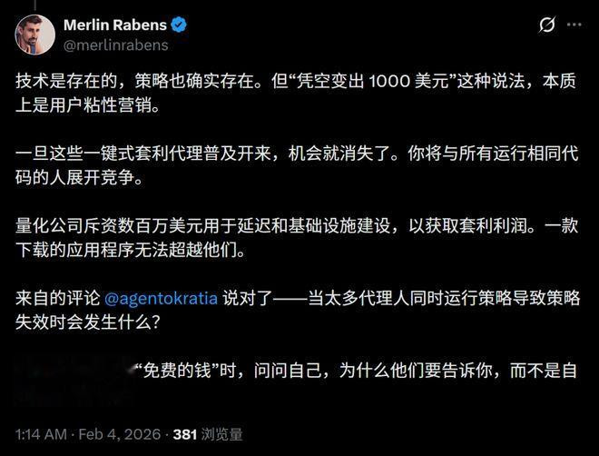 现在用Clawdbot跑套利政策,可能还有点麻烦,需要装依赖,配API,连钱包,写Prompt,Debug报错。