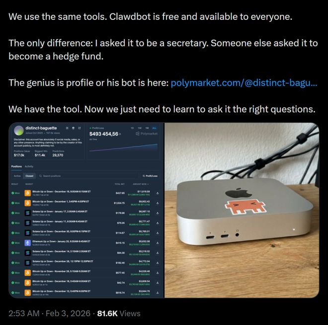 已经有聪明的人类,用Clawdbot狂赚49.3万美元了。