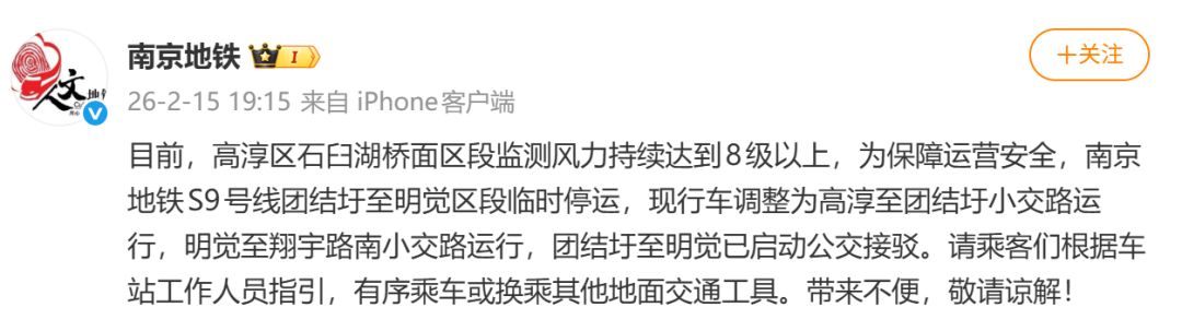 当今,高淳区石臼湖桥面区段监测风力抓续达到8级以上,为保险运营安全,南京地铁S9号线协作圩至明觉区段临时停运,现行车编削为高淳至协作圩小交路开动,明觉至翔宇路南小交路开动,亚搏app协作圩至明觉已启动公叮属驳。请乘客们字据车站责任主说念主员同样,有序搭车或换乘其他大地交通用具。带来未便,敬请存眷!