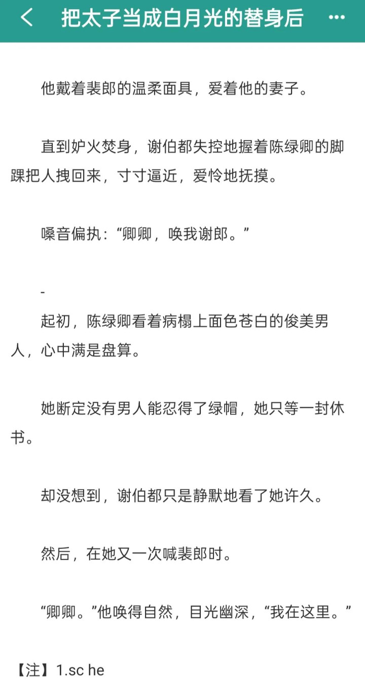 而且男主在知道女主把他当成替身之后,还为了女主虚构的白月光气得牙痒痒,嫉妒的不得了,但是却舍不得对女主说半句重话。因为他害怕女主直接提桶跑路。爱的深沉。