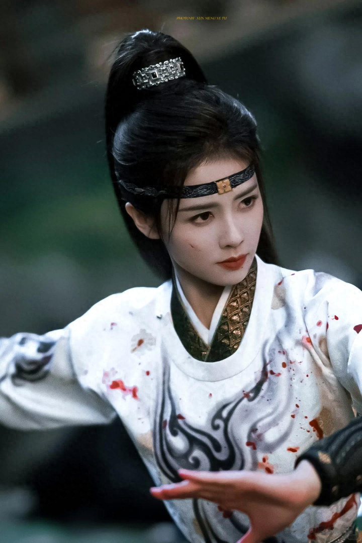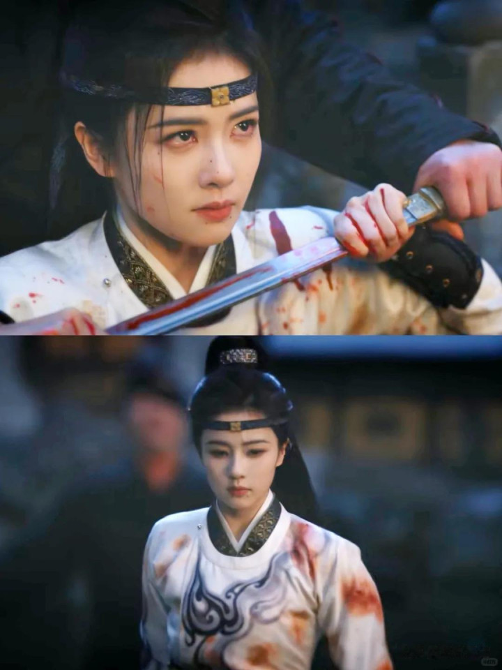 有一场雨中格斗戏,她吊了 12 小时威亚,膝盖都青肿了也没喊停,最后呈现出的效果,红衣执剑、雨中厮杀,帅得让人挪不开眼。